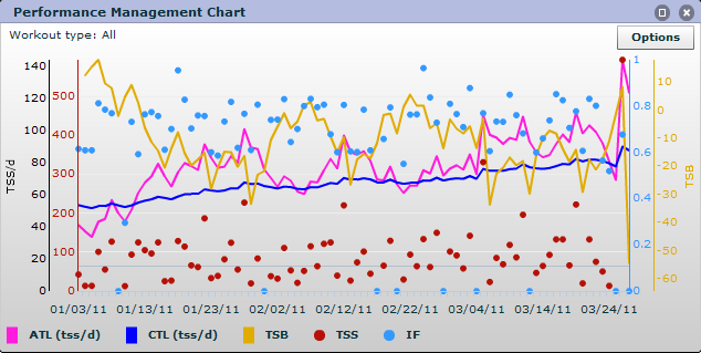 Good week of training. My legs are eating this stuff up and feeling stronger all the time. Tues, Wed, and Thurs were all good efforts in the 150 range for average heart rate. The other days were all easy plus a nice long run on Saturday. Good to see the CTL climbing up at a nice rate now. If my heel would let me, I would be pushing for more. For now, I’ll take what I can get.