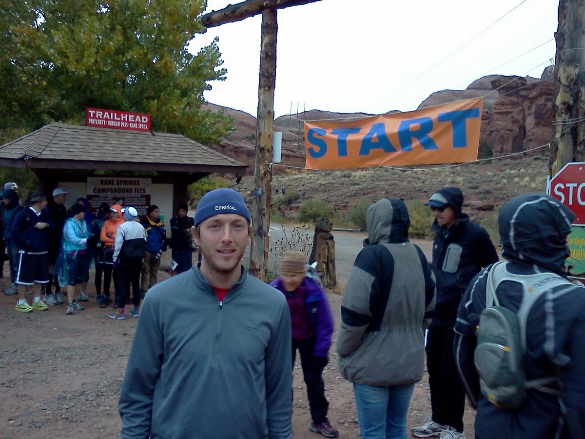 After enjoying a beautiful afternoon doing a short hike and some shopping in town, the weather took a turn for the worse and it rained hard all night long.  I seem to have a pretty good streak going with rain-soaked races in Moab.  We drove out to the start area while it was still dark, and waited anxiously for daybreak.  Wondering what kind of scene the dawn would reveal.