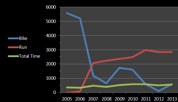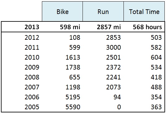 I think I ran better back in 2009 and 2010 when my mileage was lower, but time on the bike was higher. My ideal mix seems to be about 2,500 running and 1,500 bike (which are usually all MTB miles, so they don’t rack up quite as fast).